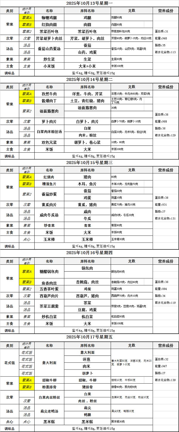 2025学年第一学期第7周学生菜单(10月13日——10月17日)