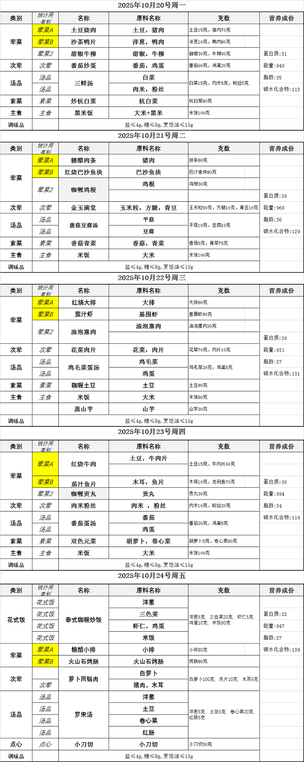 2025学年第一学期第7周学生菜单(10月13日——10月17日)