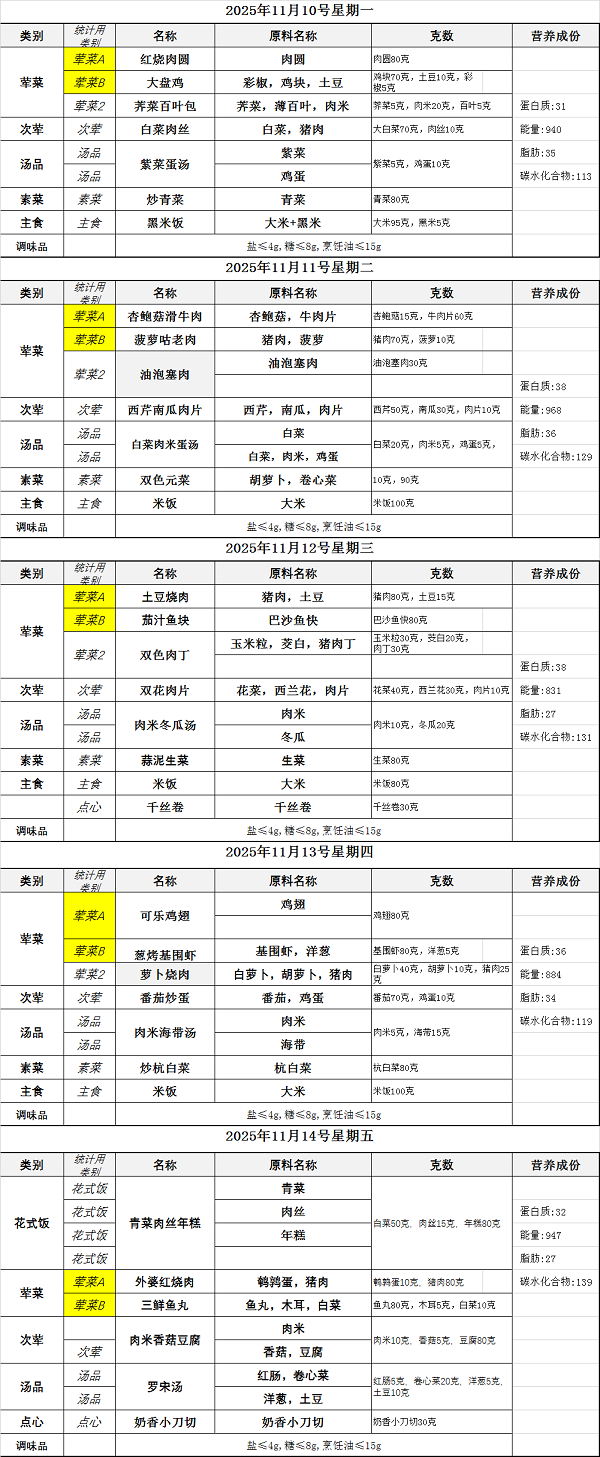 2025学年第一学期第11周学生菜单(11月10日——11月14日)