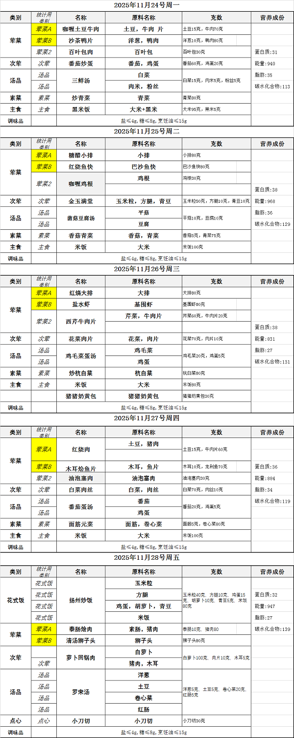 2025学年第一学期第13周学生菜单(11月24日——11月28日)