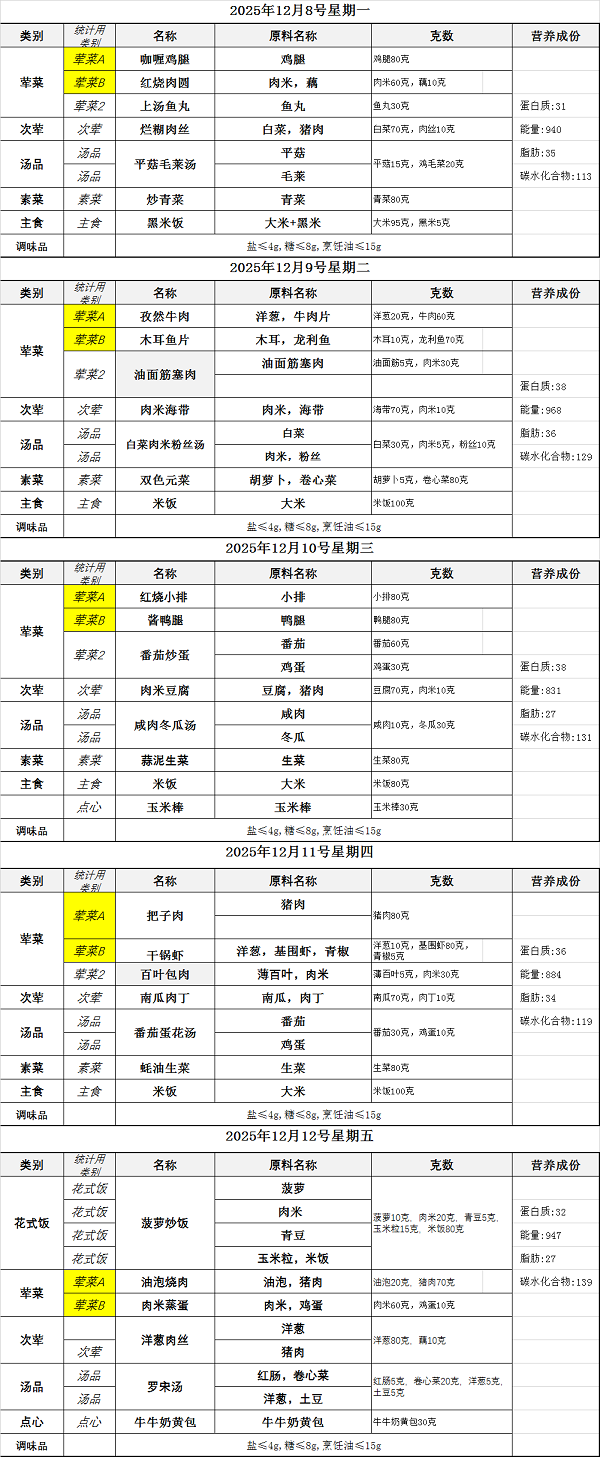 2025学年第一学期第15周学生菜单(12月8日——12月12日)