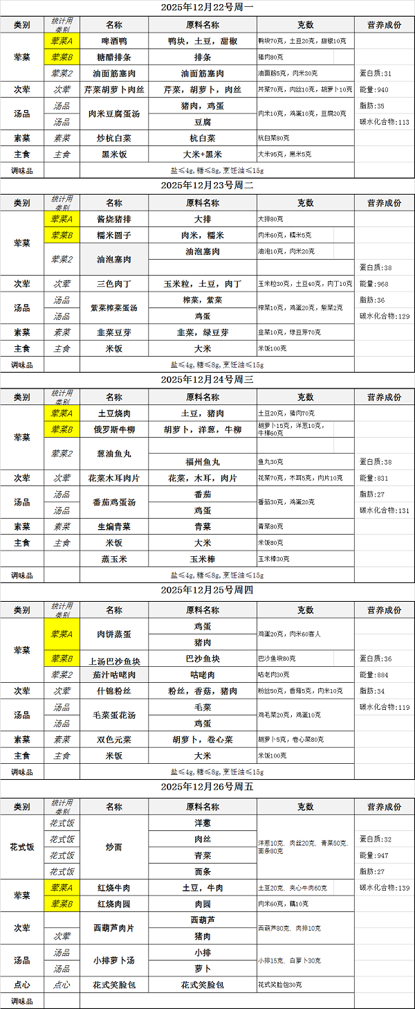 2025学年第一学期第17周学生菜单(12月22日——12月26日)