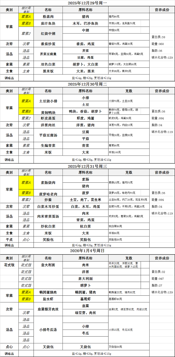 2025学年第一学期第18周学生菜单(12月29日——1月4日)