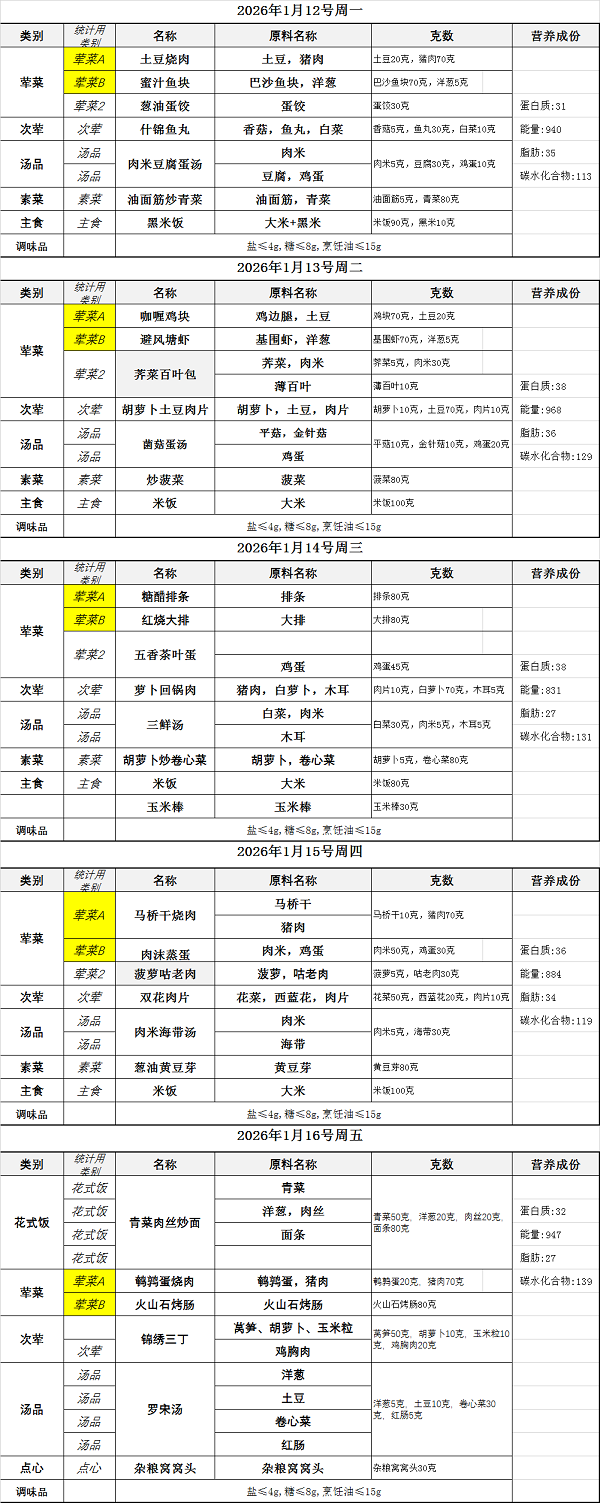 2025学年第一学期第20周学生菜单(1月12日——1月16日)