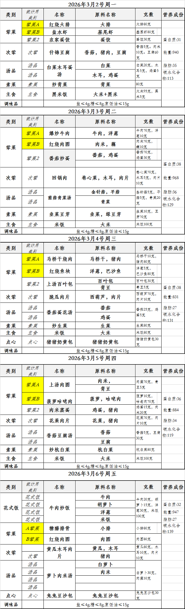 每周食谱