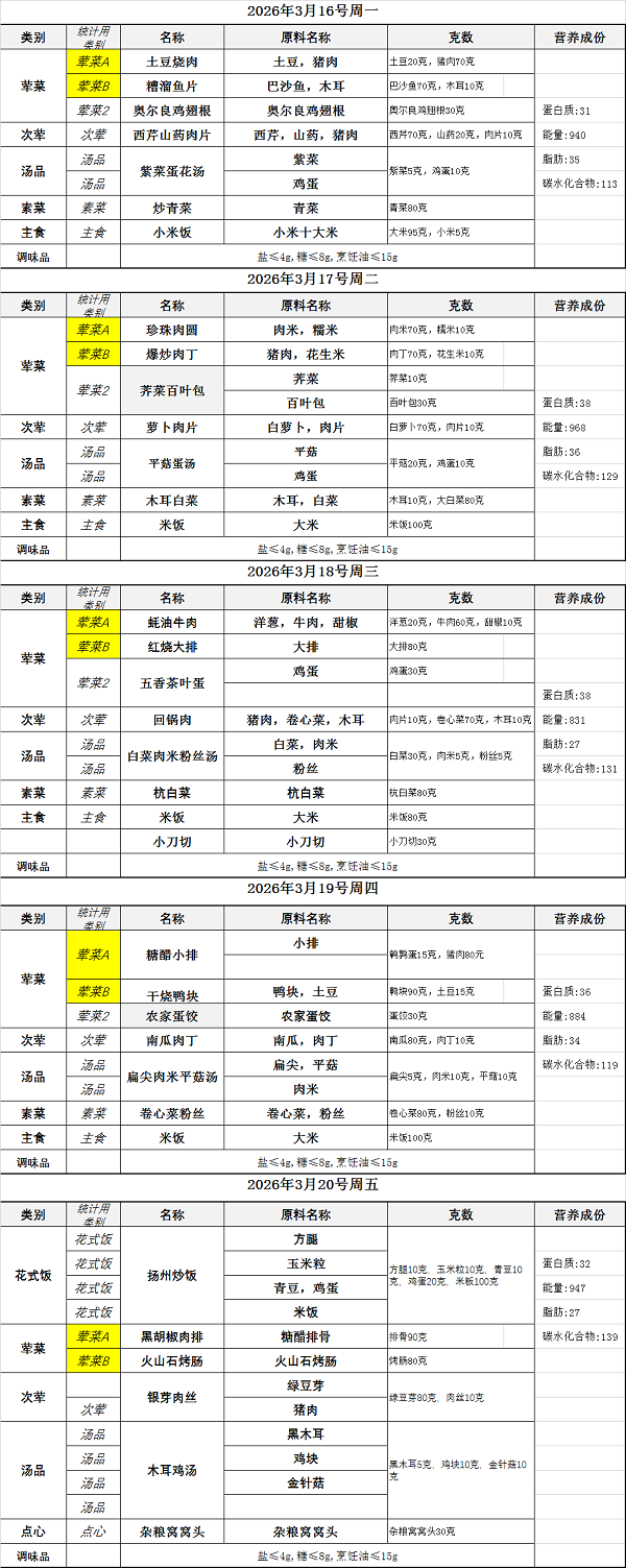 2025学年第二学期第3周学生菜单(3月16日——3月20日)