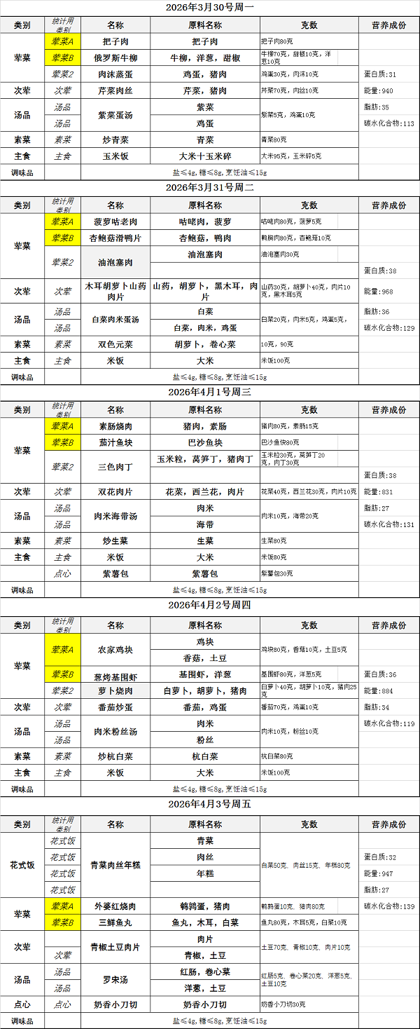 2025学年第二学期第5周学生菜单(3月30日——4月3日)